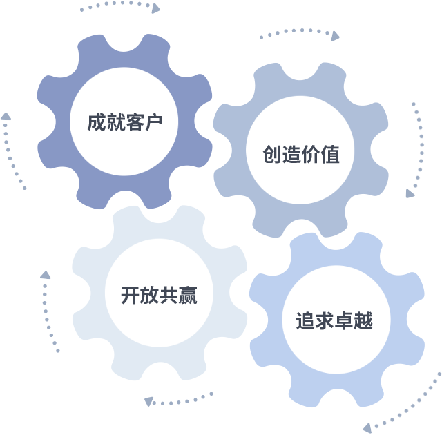 成就客户是一切决策的出发点,,,,创造价值是衡量所有工作的标准,,,追求卓越是我们做事做人的态度,,,,开放共赢是我们的格局也是最终的结果。。。。价值观的齿轮环环相扣,,推动着组织里的每个人不断向前。。